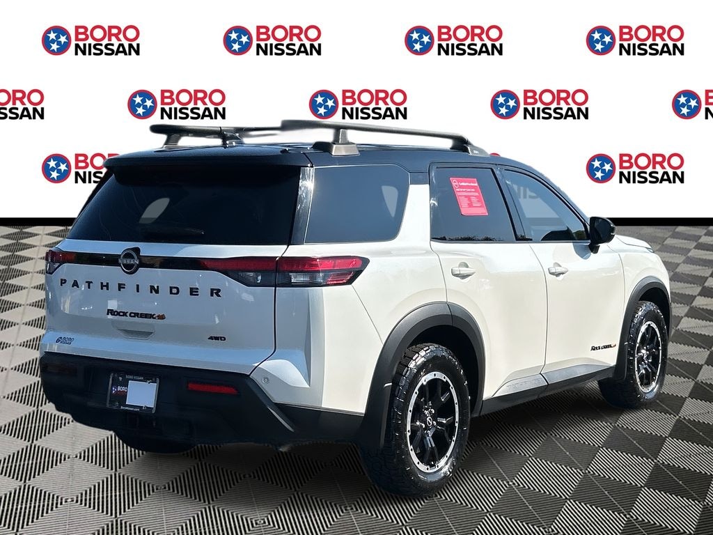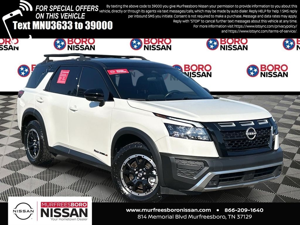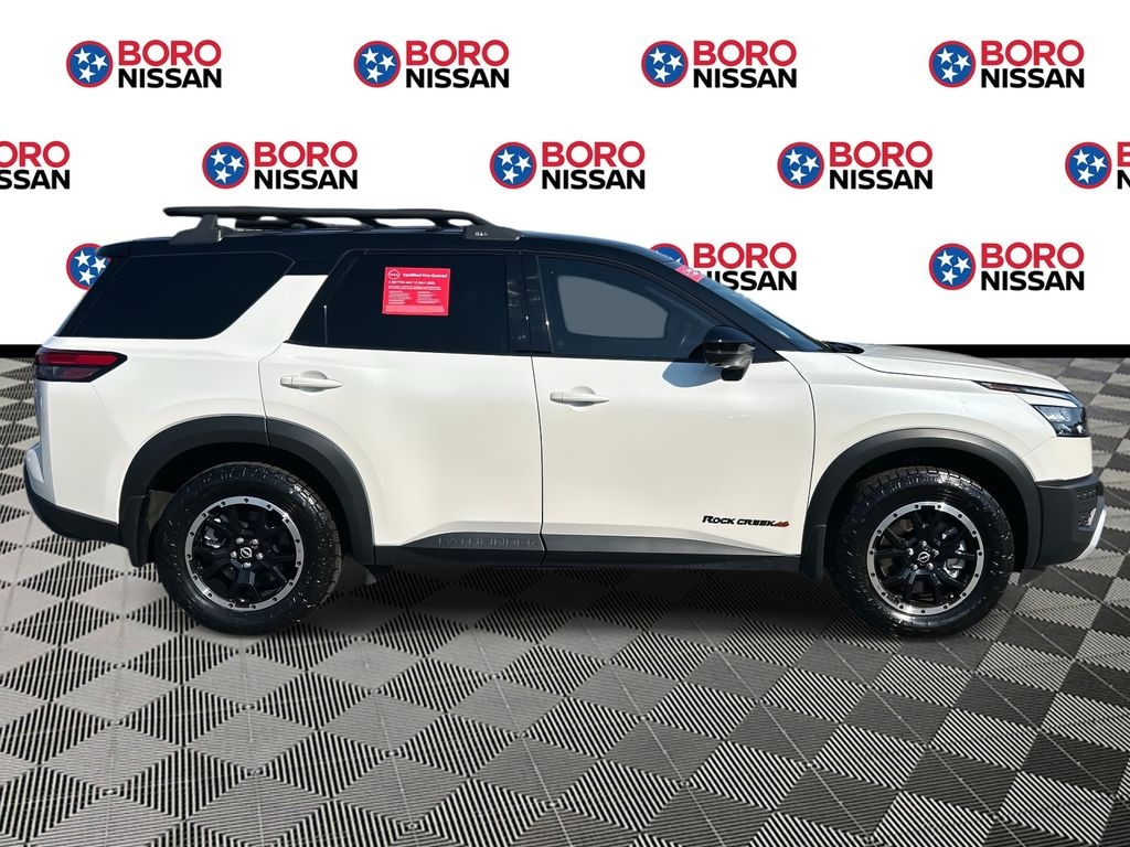 Certified. Pearl White Tricoat/Super Black 2024 Nissan Pathfinder Rock Creek 4WD 3.5L V6 DOHC 9-Speed Automatic