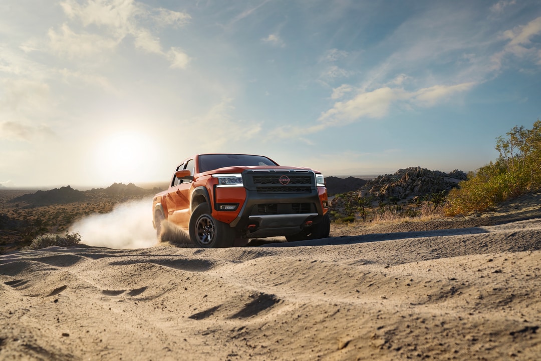 - Frontier Crew Cab PRO-X: Take on any terrain with stylish 17-inch wheels, Bilstein off-road shocks, and a Dana rear axle.