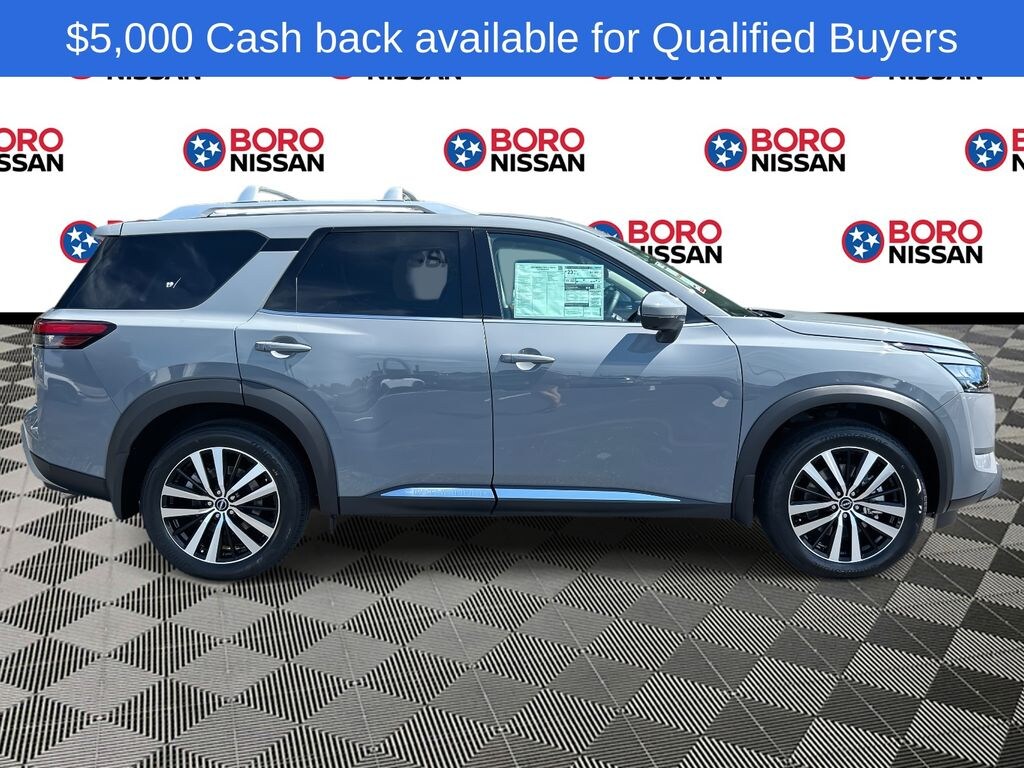 Boulder Gray Pearl 2025 Nissan Pathfinder Platinum FWD 9-Speed Automatic 3.5L V6 DOHC 13 Speakers, 3rd row seats: bench, 4-Wheel Disc Brakes, ABS brakes, Air Conditioning, Alloy wheels, AM/FM radio: SiriusXM, Auto High-beam Headlights, Auto tilt-away steering wheel, Auto-dimming Rear-View mirror, Automatic temperature control, Bench Seat Carpeted Floor Mats (Set of 4), Black Splash Guards (Set of 4), Bodyside moldings, Bose Premium Audio System, Brake assist, Bumpers: body-color, Cargo Area Protector, Cargo Net, Cargo Package, Climate Controlled Front Bucket Seats, Cross Bars, Delay-off headlights, Driver door bin, Driver vanity mirror, Dual front impact airbags, Dual front side impact airbags, Electronic Stability Control, Emergency communication system, Exterior Parking Camera Rear, First Aid, Four wheel independent suspension, Front anti-roll bar, Front Bucket Seats, Front Center Armrest, Front dual zone A/C, Front reading lights, Fully automatic headlights, Garage door transmitter: HomeLink, Heads-Up Display, Heated door mirrors, Heated front seats, Heated rear seats, Heated steering wheel, Illuminated entry, Knee airbag, Leather steering wheel, Low tire pressure warning, Memory seat, Navigation system: NissanConnect with Navigation and Services, NissanConnect featuring Apple CarPlay and Android Auto, NissanConnect w/Navigation & Services, Occupant sensing airbag, Outside temperature display, Overhead airbag, Overhead console, Panic alarm, Passenger door bin, Passenger vanity mirror, Power door mirrors, Power driver seat, Power Liftgate, Power moonroof, Power passenger seat, Power steering, Power windows, Premium Paint, Radio data system, Radio: AM/FM Audio System, Rain sensing wipers, Rear air conditioning, Rear anti-roll bar, Rear reading lights, Rear seat center armrest, Rear side impact airbag, Rear window defroster, Rear window wiper, Reclining 3rd row seat, Remote keyless entry, Security system, Semi-Aniline Leather-Appointed Seating Surfaces, Speed control, Speed-sensing steering, Speed-Sensitive Wipers, Split folding rear seat, Spoiler, Steering wheel memory, Steering wheel mounted audio controls, Tachometer, Telescoping steering wheel, Tilt steering wheel, Traction control, Trip computer, Turn signal indicator mirrors, Variably intermittent wipers, Ventilated front seats, Wheels: 20" x 8J Machined Alloy, SUNROOF, THIRD ROW, LEATHER, NAVIGATION, ALLOY WHEELS.