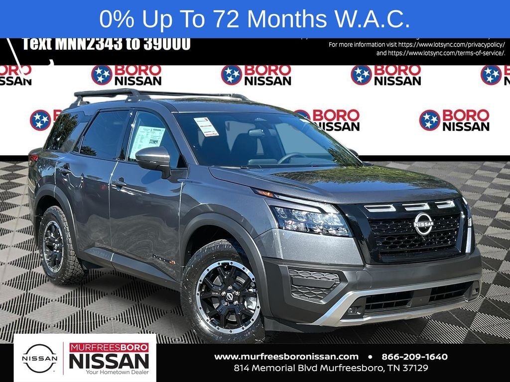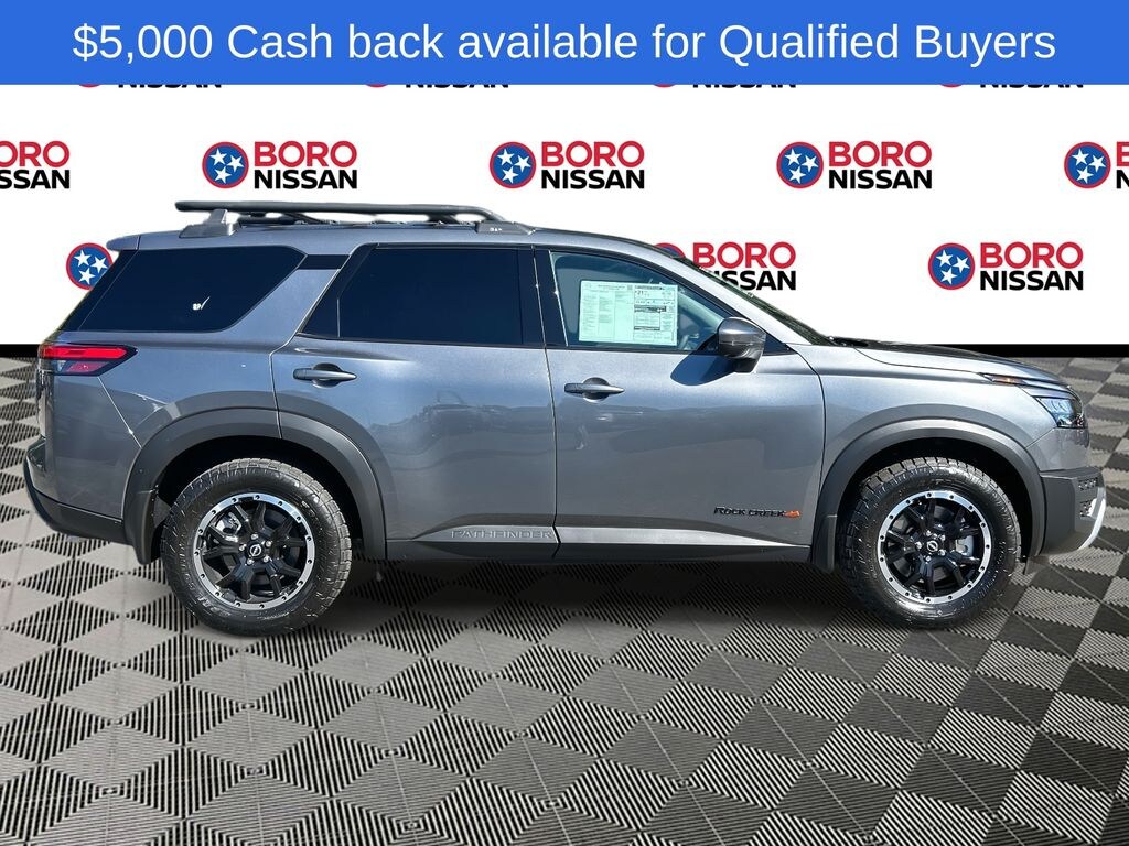 Gun Metallic 2025 Nissan Pathfinder Rock Creek 4WD 9-Speed Automatic 3.5L V6 DOHC 4WD, 3rd row seats: bench, 4-Wheel Disc Brakes, 6 Speakers, ABS brakes, Air Conditioning, Alloy wheels, AM/FM radio: SiriusXM, Auto High-beam Headlights, Automatic temperature control, Brake assist, Delay-off headlights, Driver door bin, Driver vanity mirror, Dual front impact airbags, Dual front side impact airbags, Electronic Stability Control, Emergency communication system, Four wheel independent suspension, Front anti-roll bar, Front Bucket Seats, Front Center Armrest, Front dual zone A/C, Front fog lights, Front reading lights, Fully automatic headlights, Heated door mirrors, Heated Front Bucket Seats, Heated front seats, Illuminated entry, Knee airbag, Leather steering wheel, Leatherette-Appointed Seating Surfaces, Low tire pressure warning, NissanConnect featuring Apple CarPlay and Android Auto, Occupant sensing airbag, Outside temperature display, Overhead airbag, Overhead console, Panic alarm, Passenger door bin, Passenger vanity mirror, Power door mirrors, Power driver seat, Power Liftgate, Power steering, Power windows, Radio data system, Radio: AM/FM Audio System w/NissanConnect, Rear air conditioning, Rear anti-roll bar, Rear Parking Sensors, Rear reading lights, Rear side impact airbag, Rear window defroster, Rear window wiper, Reclining 3rd row seat, Remote keyless entry, Rock Creek AS Floor Liners & Cargo Area Protector, Roof rack, Security system, Speed control, Speed-sensing steering, Split folding rear seat, Spoiler, Steering wheel mounted audio controls, Tachometer, Telescoping steering wheel, Tilt steering wheel, Traction control, Trip computer, Turn signal indicator mirrors, Variably intermittent wipers, Wheels: 18" x 8J Machined Alloy w/Black Finish, 4WD.