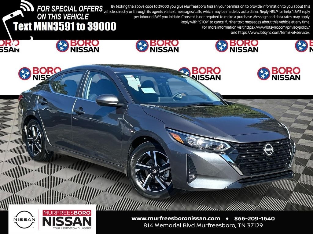 Gun Metallic 2025 Nissan Sentra SV FWD CVT with Xtronic 2.0L I4 DOHC APPLE ANDRIOD CAR PLAY, REAR BACKUP CAMERA, BLUETOOTH, CVT with Xtronic, Charcoal Cloth, 16" Alloy Wheels, 4-Wheel Disc Brakes, 8 Speakers, ABS brakes, Air Conditioning, All-Weather Package, Alloy wheels, AM/FM radio: SiriusXM, Auto High-beam Headlights, Blind Spot Warning, Body Colored Splash Guards (4-Piece), Brake assist, Bumpers: body-color, Carpeted Floor Mats w/Trunk Mat, Clear Rear Bumper Protector, Delay-off headlights, Door Sill Plates, Driver door bin, Driver vanity mirror, Dual front impact airbags, Dual front side impact airbags, Dual Zone Auto Climate Control, Electronic Stability Control, Four wheel independent suspension, Front anti-roll bar, Front Bucket Seats, Front Center Armrest, Front reading lights, Fully automatic headlights, Heated Exterior Mirrors, Heated Front Seats, Illuminated entry, Knee airbag, Leather-Wrapped Heated Steering Wheel, Low tire pressure warning, NissanConnect featuring Apple CarPlay and Android Auto, Occupant sensing airbag, Outside temperature display, Overhead airbag, Overhead console, Panic alarm, Passenger door bin, Passenger vanity mirror, Power door mirrors, Power steering, Power windows, Radio data system, Radio: AM/FM w/RDS/MP3/Aux-In, Rear anti-roll bar, Rear Parking Sensors, Rear side impact airbag, Rear window defroster, Remote Engine Start, Remote keyless entry, Security system, Speed control, Speed-sensing steering, Split folding rear seat, Steering wheel mounted audio controls, Tachometer, Telescoping steering wheel, Tilt steering wheel, Traction control, Trip computer, Upgraded Cloth Seat Trim, Variably intermittent wipers, NAVIGATION, ALLOY WHEELS, CVT with Xtronic, Charcoal Cloth.