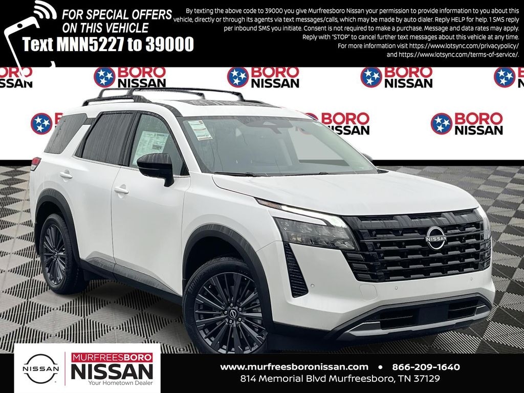 Everest White Pearl Tricoat 2026 Nissan Pathfinder SL FWD 9-Speed Automatic 3.5L V6 DOHC CAPTAINS CHAIRS, APPLE ANDRIOD CAR PLAY, REAR BACKUP CAMERA, BLUETOOTH, 18" Machined Alloy Wheels, 2nd Row Manual Sunshades, 2nd-Row Captain Chairs, 3rd row seats: bench, 4-Piece Black Splash Guards, 4-Wheel Disc Brakes, 6 Speakers, ABS brakes, Air Conditioning, Alloy wheels, AM/FM radio: SiriusXM w/360L, Auto High-beam Headlights, Auto-dimming Rear-View mirror, Automatic temperature control, Bose Premium Audio System, Brake assist, Bumpers: body-color, Captain's Chairs Carpeted Floor Mats, Cross Bars, Delay-off headlights, Driver door bin, Driver vanity mirror, Dual front impact airbags, Dual front side impact airbags, Electronic Stability Control, Emergency communication system: NissanConnect Services, Four wheel independent suspension, Front anti-roll bar, Front Bucket Seats, Front Center Armrest, Front dual zone A/C, Front reading lights, Fully automatic headlights, Garage door transmitter: HomeLink, Heated door mirrors, Heated Front Bucket Seats, Heated front seats, Heated Rear Seats, Heated steering wheel, Illuminated entry, Knee airbag, Low tire pressure warning, NissanConnect featuring Apple CarPlay and Android Auto, Occupant sensing airbag, Outside temperature display, Overhead airbag, Overhead console, Panic alarm, Panoramic Moonroof, Passenger door bin, Passenger vanity mirror, Power door mirrors, Power driver seat, Power Liftgate, Power steering, Power windows, Premium Paint, Radio data system, Radio: AM/FM Audio System with NissanConnect, Rear air conditioning, Rear anti-roll bar, Rear reading lights, Rear seat center armrest, Rear side impact airbag, Rear window defroster, Rear window wiper, Reclining 3rd row seat, Remote keyless entry, Removable Center Console, Security system, SL Premium Package, Speed control, Speed-sensing steering, Split folding rear seat, Spoiler, Steering wheel mounted audio controls, Tachometer, TailorFit Appointed Seating Surfaces, Telescoping steering wheel, Tilt steering wheel, Tow Hitch Receiver and Harness, Traction control, Trip computer, Turn signal indicator mirrors, Variably intermittent wipers, Wheels: 20" Machined Alloy with Dark Metallic Gray Finish, SUNROOF, THIRD ROW, LEATHER, NAVIGATION, ALLOY WHEELS.