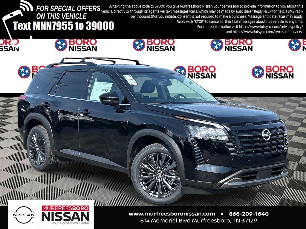 Super Black 2026 Nissan Pathfinder SL 4WD 9-Speed Automatic 3.5L V6 DOHC CAPTAINS CHAIRS, APPLE ANDRIOD CAR PLAY, REAR BACKUP CAMERA, BLUETOOTH, 4WD, 18" Machined Alloy Wheels, 2nd Row Manual Sunshades, 2nd-Row Captain Chairs, 3rd row seats: bench, 4-Piece Black Splash Guards, 4-Wheel Disc Brakes, 6 Speakers, ABS brakes, Air Conditioning, Alloy wheels, AM/FM radio: SiriusXM w/360L, Auto High-beam Headlights, Auto-dimming Rear-View mirror, Automatic temperature control, Bose Premium Audio System, Brake assist, Bumpers: body-color, Captain's Chairs Carpeted Floor Mats, Cross Bars, Delay-off headlights, Driver door bin, Driver vanity mirror, Dual front impact airbags, Dual front side impact airbags, Electronic Stability Control, Emergency communication system: NissanConnect Services, Four wheel independent suspension, Front anti-roll bar, Front Bucket Seats, Front Center Armrest, Front dual zone A/C, Front reading lights, Fully automatic headlights, Garage door transmitter: HomeLink, Heated door mirrors, Heated Front Bucket Seats, Heated front seats, Heated Rear Seats, Heated steering wheel, Illuminated entry, Knee airbag, Low tire pressure warning, NissanConnect featuring Apple CarPlay and Android Auto, Occupant sensing airbag, Outside temperature display, Overhead airbag, Overhead console, Panic alarm, Panoramic Moonroof, Passenger door bin, Passenger vanity mirror, Power door mirrors, Power driver seat, Power Liftgate, Power steering, Power windows, Radio data system, Radio: AM/FM Audio System with NissanConnect, Rear air conditioning, Rear anti-roll bar, Rear reading lights, Rear seat center armrest, Rear side impact airbag, Rear window defroster, Rear window wiper, Reclining 3rd row seat, Remote keyless entry, Removable Center Console, Security system, SL Premium Package, Speed control, Speed-sensing steering, Split folding rear seat, Spoiler, Steering wheel mounted audio controls, Tachometer, TailorFit Appointed Seating Surfaces, Telescoping steering wheel, Tilt steering wheel, Tow Hitch Receiver and Harness, Traction control, Trip computer, Turn signal indicator mirrors, Variably intermittent wipers, Wheels: 20" Machined Alloy with Dark Metallic Gray Finish, SUNROOF, THIRD ROW, LEATHER, NAVIGATION, ALLOY WHEELS, 4WD.