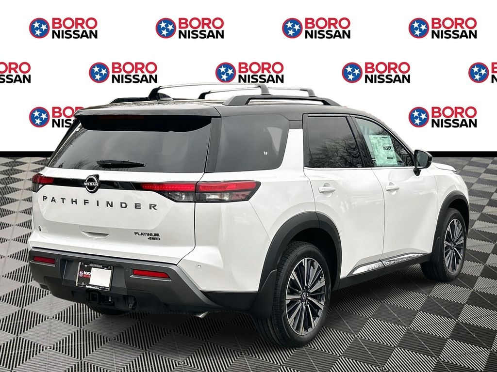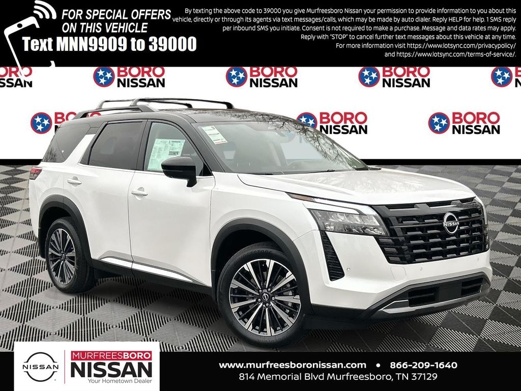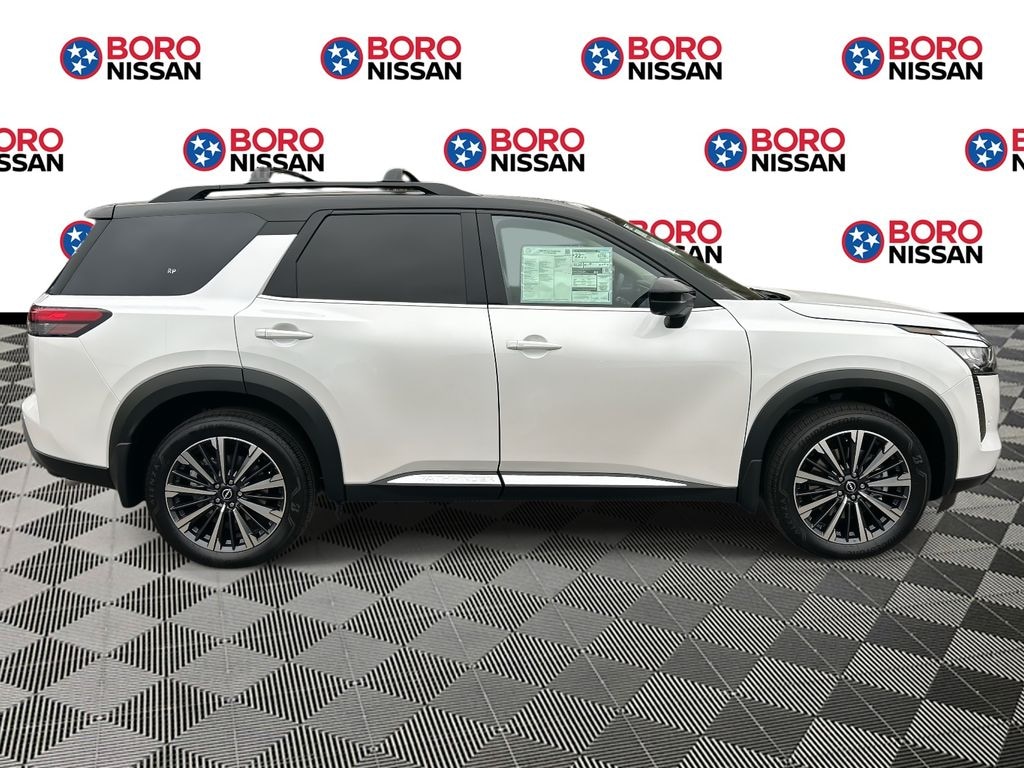 Everest White Pearl/Black 2026 Nissan Pathfinder Platinum 4WD 9-Speed Automatic 3.5L V6 DOHC CAPTAINS CHAIRS, APPLE ANDRIOD CAR PLAY, REAR BACKUP CAMERA, BLUETOOTH, 4WD, 13 Speakers, 2nd-Row Captain Chairs, 2nd-Row Removable Centre Console, 3rd row seats: bench, 4-Piece Black Splash Guards, 4-Wheel Disc Brakes, ABS brakes, Air Conditioning, Alloy wheels, AM/FM radio: SiriusXM w/360L, Auto High-beam Headlights, Auto tilt-away steering wheel, Auto-dimming Rear-View mirror, Automatic temperature control, Bodyside moldings, Bose Premium Audio System, Brake assist, Bumpers: body-color, Captain's Chairs Carpeted Floor Mats, Cargo Area Protector, Cargo Net, Cargo Package, Climate Controlled Front Bucket Seats, Cross Bars, Delay-off headlights, Driver door bin, Driver vanity mirror, Dual front impact airbags, Dual front side impact airbags, Electronic Stability Control, Emergency communication system: NissanConnect Services, First Aid, Four wheel independent suspension, Front anti-roll bar, Front Bucket Seats, Front Center Armrest, Front dual zone A/C, Front reading lights, Fully automatic headlights, Garage door transmitter: HomeLink, Heads-Up Display, Heated door mirrors, Heated front seats, Heated rear seats, Heated steering wheel, Illuminated entry, Knee airbag, Low tire pressure warning, Memory seat, Navigation system: NissanConnect with Navigation and Services, NissanConnect featuring Apple CarPlay and Android Auto, Occupant sensing airbag, Outside temperature display, Overhead airbag, Overhead console, Panic alarm, Passenger door bin, Passenger vanity mirror, Platinum Captain Chairs Package, Power door mirrors, Power driver seat, Power Liftgate, Power moonroof, Power passenger seat, Power steering, Power windows, Premium Paint and 2-Tone Roof, Radio data system, Radio: AM/FM Audio System with NissanConnect, Rain sensing wipers, Rear air conditioning, Rear anti-roll bar, Rear reading lights, Rear seat center armrest, Rear side impact airbag, Rear window defroster, Rear window wiper, Reclining 3rd row seat, Remote keyless entry, Security system, Semi-Aniline Leather-Appointed Seating Surfaces, Speed control, Speed-sensing steering, Speed-Sensitive Wipers, Split folding rear seat, Spoiler, Steering wheel memory, Steering wheel mounted audio controls, Tachometer, Telescoping steering wheel, Tilt steering wheel, Traction control, Trip computer, Turn signal indicator mirrors, Variably intermittent wipers, Ventilated front seats, Wheels: 20" Machined Alloy, SUNROOF, THIRD ROW, LEATHER, NAVIGATION, ALLOY WHEELS, 4WD.