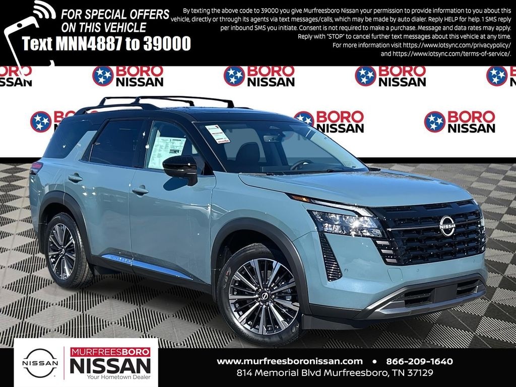 Baltic Teal/Super Black 2026 Nissan Pathfinder Platinum FWD 9-Speed Automatic 3.5L V6 DOHC CAPTAINS CHAIRS, APPLE ANDRIOD CAR PLAY, REAR BACKUP CAMERA, BLUETOOTH, 13 Speakers, 2nd-Row Captain Chairs, 2nd-Row Removable Centre Console, 3rd row seats: bench, 4-Piece Black Splash Guards, 4-Wheel Disc Brakes, ABS brakes, Air Conditioning, Alloy wheels, AM/FM radio: SiriusXM w/360L, Auto High-beam Headlights, Auto tilt-away steering wheel, Auto-dimming Rear-View mirror, Automatic temperature control, Bodyside moldings, Bose Premium Audio System, Brake assist, Bumpers: body-color, Captain's Chairs Carpeted Floor Mats, Cargo Area Protector, Cargo Net, Cargo Package, Climate Controlled Front Bucket Seats, Cross Bars, Delay-off headlights, Driver door bin, Driver vanity mirror, Dual front impact airbags, Dual front side impact airbags, Electronic Stability Control, Emergency communication system: NissanConnect Services, First Aid, Four wheel independent suspension, Front anti-roll bar, Front Bucket Seats, Front Center Armrest, Front dual zone A/C, Front reading lights, Fully automatic headlights, Garage door transmitter: HomeLink, Heads-Up Display, Heated door mirrors, Heated front seats, Heated rear seats, Heated steering wheel, Illuminated entry, Knee airbag, Low tire pressure warning, Memory seat, Navigation System, NissanConnect featuring Apple CarPlay and Android Auto, Occupant sensing airbag, Outside temperature display, Overhead airbag, Overhead console, Panic alarm, Passenger door bin, Passenger vanity mirror, Platinum Captain Chairs Package, Power door mirrors, Power driver seat, Power Liftgate, Power moonroof, Power passenger seat, Power steering, Power windows, Premium Paint and 2-Tone Roof, Radio data system, Radio: AM/FM Audio System with NissanConnect, Rain sensing wipers, Rear air conditioning, Rear anti-roll bar, Rear reading lights, Rear seat center armrest, Rear side impact airbag, Rear window defroster, Rear window wiper, Reclining 3rd row seat, Remote keyless entry, Security system, Semi-Aniline Leather-Appointed Seating Surfaces, Speed control, Speed-sensing steering, Speed-Sensitive Wipers, Split folding rear seat, Spoiler, Steering wheel memory, Steering wheel mounted audio controls, Tachometer, Telescoping steering wheel, Tilt steering wheel, Traction control, Trip computer, Turn signal indicator mirrors, Variably intermittent wipers, Ventilated front seats, Wheels: 20" Machined Alloy, SUNROOF, THIRD ROW, LEATHER, NAVIGATION, ALLOY WHEELS.