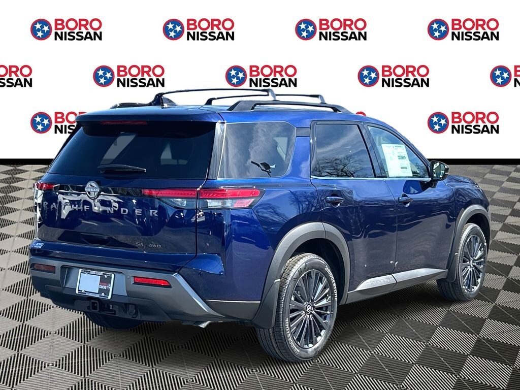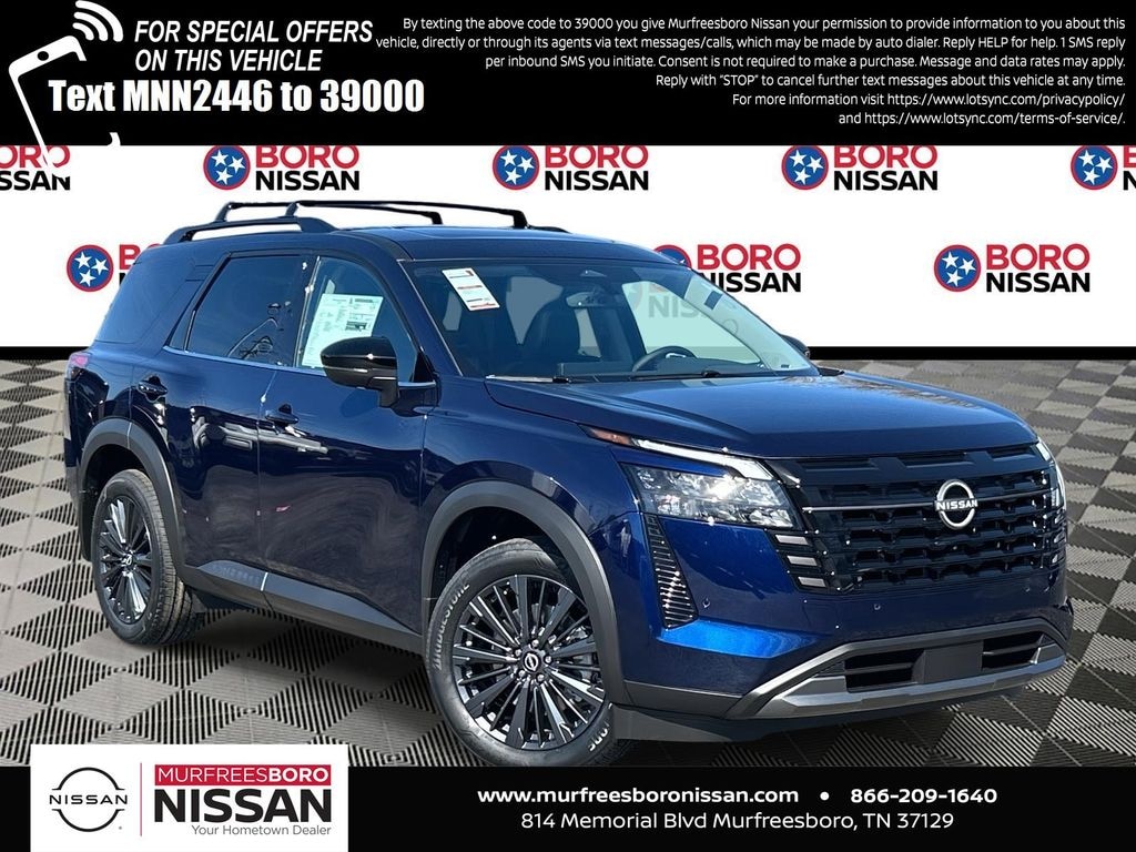 Deep Ocean Blue Pearl 2026 Nissan Pathfinder SL 4WD 9-Speed Automatic 3.5L V6 DOHC CAPTAINS CHAIRS, APPLE ANDRIOD CAR PLAY, REAR BACKUP CAMERA, BLUETOOTH, 4WD, 18" Machined Alloy Wheels, 2nd Row Manual Sunshades, 2nd-Row Captain Chairs, 3rd row seats: bench, 4-Piece Black Splash Guards, 4-Wheel Disc Brakes, 6 Speakers, ABS brakes, Air Conditioning, Alloy wheels, AM/FM radio: SiriusXM w/360L, Auto High-beam Headlights, Auto-dimming Rear-View mirror, Automatic temperature control, Bose Premium Audio System, Brake assist, Bumpers: body-color, Captain's Chairs Carpeted Floor Mats, Cross Bars, Delay-off headlights, Driver door bin, Driver vanity mirror, Dual front impact airbags, Dual front side impact airbags, Electronic Stability Control, Emergency communication system: NissanConnect Services, Four wheel independent suspension, Front anti-roll bar, Front Bucket Seats, Front Center Armrest, Front dual zone A/C, Front reading lights, Fully automatic headlights, Garage door transmitter: HomeLink, Heated door mirrors, Heated Front Bucket Seats, Heated front seats, Heated Rear Seats, Heated steering wheel, Illuminated entry, Knee airbag, Low tire pressure warning, NissanConnect featuring Apple CarPlay and Android Auto, Occupant sensing airbag, Outside temperature display, Overhead airbag, Overhead console, Panic alarm, Panoramic Moonroof, Passenger door bin, Passenger vanity mirror, Power door mirrors, Power driver seat, Power Liftgate, Power steering, Power windows, Radio data system, Radio: AM/FM Audio System with NissanConnect, Rear air conditioning, Rear anti-roll bar, Rear reading lights, Rear seat center armrest, Rear side impact airbag, Rear window defroster, Rear window wiper, Reclining 3rd row seat, Remote keyless entry, Removable Center Console, Security system, SL Premium Package, Speed control, Speed-sensing steering, Split folding rear seat, Spoiler, Steering wheel mounted audio controls, Tachometer, TailorFit Appointed Seating Surfaces, Telescoping steering wheel, Tilt steering wheel, Tow Hitch Receiver and Harness, Traction control, Trip computer, Turn signal indicator mirrors, Variably intermittent wipers, Wheels: 20" Machined Alloy with Dark Metallic Gray Finish, SUNROOF, THIRD ROW, NAVIGATION, ALLOY WHEELS, 4WD.