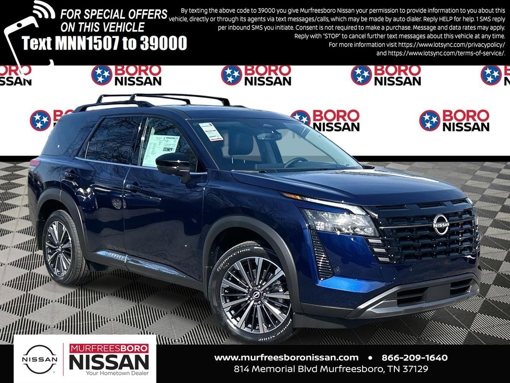 Deep Ocean Blue Pearl 2026 Nissan Pathfinder Platinum 4WD 9-Speed Automatic 3.5L V6 DOHC APPLE ANDRIOD CAR PLAY, REAR BACKUP CAMERA, BLUETOOTH, 4WD, 13 Speakers, 3rd row seats: bench, 4-Piece Black Splash Guards, 4-Wheel Disc Brakes, ABS brakes, Air Conditioning, Alloy wheels, AM/FM radio: SiriusXM w/360L, Auto High-beam Headlights, Auto tilt-away steering wheel, Auto-dimming Rear-View mirror, Automatic temperature control, Bench Seat Carpeted Floor Mats, Bodyside moldings, Bose Premium Audio System, Brake assist, Bumpers: body-color, Cargo Area Protector, Cargo Net, Cargo Package, Climate Controlled Front Bucket Seats, Cross Bars, Delay-off headlights, Driver door bin, Driver vanity mirror, Dual front impact airbags, Dual front side impact airbags, Electronic Stability Control, Emergency communication system: NissanConnect Services, First Aid, Four wheel independent suspension, Front anti-roll bar, Front Bucket Seats, Front Center Armrest, Front dual zone A/C, Front reading lights, Fully automatic headlights, Garage door transmitter: HomeLink, Heads-Up Display, Heated door mirrors, Heated front seats, Heated rear seats, Heated steering wheel, Illuminated entry, Knee airbag, Low tire pressure warning, Memory seat, NissanConnect featuring Apple CarPlay and Android Auto, Occupant sensing airbag, Outside temperature display, Overhead airbag, Overhead console, Panic alarm, Passenger door bin, Passenger vanity mirror, Power door mirrors, Power driver seat, Power Liftgate, Power moonroof, Power passenger seat, Power steering, Power windows, Radio data system, Radio: AM/FM Audio System with NissanConnect, Rain sensing wipers, Rear air conditioning, Rear anti-roll bar, Rear reading lights, Rear seat center armrest, Rear side impact airbag, Rear window defroster, Rear window wiper, Reclining 3rd row seat, Remote keyless entry, Security system, Semi-Aniline Leather-Appointed Seating Surfaces, Speed control, Speed-sensing steering, Speed-Sensitive Wipers, Split folding rear seat, Spoiler, Steering wheel memory, Steering wheel mounted audio controls, Tachometer, Telescoping steering wheel, Tilt steering wheel, Traction control, Trip computer, Turn signal indicator mirrors, Variably intermittent wipers, Ventilated front seats, Wheels: 20" Machined Alloy, SUNROOF, THIRD ROW, LEATHER, NAVIGATION, ALLOY WHEELS, 4WD.