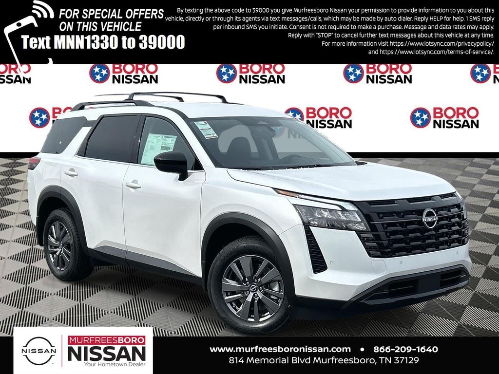 Everest White Pearl Tricoat 2026 Nissan Pathfinder SV FWD 9-Speed Automatic 3.5L V6 DOHC APPLE ANDRIOD CAR PLAY, REAR BACKUP CAMERA, BLUETOOTH, ABS brakes, Active Cruise Control, Alloy wheels, Electronic Stability Control, Front dual zone A/C, Heated door mirrors, Heated Front Bucket Seats, Heated front seats, Illuminated entry, Low tire pressure warning, Power Liftgate, Remote keyless entry, Traction control, 18" Painted Alloy Wheels, 3rd row seats: bench, 4-Wheel Disc Brakes, 6 Speakers, Air Conditioning, AM/FM radio: SiriusXM w/360L, Auto High-beam Headlights, Automatic temperature control, Brake assist, Bumpers: body-color, Cloth Seating Surfaces, Delay-off headlights, Driver door bin, Driver vanity mirror, Dual front impact airbags, Dual front side impact airbags, Emergency communication system: NissanConnect Services, Four wheel independent suspension, Front anti-roll bar, Front Bucket Seats, Front Center Armrest, Front reading lights, Fully automatic headlights, Garage door transmitter: myQ Connected Garage, Knee airbag, NissanConnect featuring Apple CarPlay and Android Auto, Occupant sensing airbag, Outside temperature display, Overhead airbag, Overhead console, Panic alarm, Passenger door bin, Passenger vanity mirror, Power door mirrors, Power driver seat, Power steering, Power windows, Radio data system, Radio: AM/FM Audio System with NissanConnect, Rear air conditioning, Rear anti-roll bar, Rear reading lights, Rear seat center armrest, Rear side impact airbag, Rear window defroster, Rear window wiper, Reclining 3rd row seat, Security system, Speed control, Speed-sensing steering, Split folding rear seat, Spoiler, Steering wheel mounted audio controls, Tachometer, Telescoping steering wheel, Tilt steering wheel, Trip computer, Variably intermittent wipers, THIRD ROW, NAVIGATION, ALLOY WHEELS, ABS brakes, Active Cruise Control, Alloy wheels, Electronic Stability Control, Front dual zone A/C, Heated door mirrors, Heated Front Bucket Seats, Heated front seats, Illuminated entry, Low tire pressure warning, Power Liftgate, Remote keyless entry, Traction control.