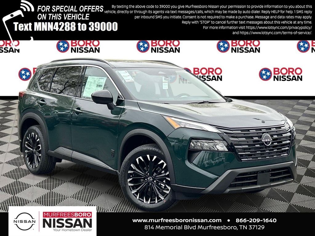 Obsidian Green 2026 Nissan Rogue Dark Armor FWD CVT with Xtronic 1.5L DOHC APPLE ANDRIOD CAR PLAY, REAR BACKUP CAMERA, BLUETOOTH, 4-Wheel Disc Brakes, 6 Speakers, ABS brakes, Air Conditioning, Alloy wheels, AM/FM radio, Apple CarPlay/Android Auto, Auto High-beam Headlights, Automatic temperature control, Black Splash Guards (set of 4), Brake assist, Bumpers: body-color, Delay-off headlights, Driver door bin, Driver vanity mirror, Dual front impact airbags, Dual front side impact airbags, Electronic Stability Control, Emergency communication system: NissanConnect Services, Exterior Parking Camera Rear, First Aid Kit, Floor Mats with 1-Piece Cargo Area Protector, Four wheel independent suspension, Frameless Rearview Mirror with Universal Remote, Front anti-roll bar, Front Bucket Seats, Front Center Armrest, Front dual zone A/C, Front reading lights, Fully automatic headlights, Heated door mirrors, Heated Front Bucket Seats, Heated front seats, Heated steering wheel, Illuminated entry, Illuminated Kick Plates, Knee airbag, Low tire pressure warning, Occupant sensing airbag, Outside temperature display, Overhead airbag, Overhead console, Panic alarm, Passenger door bin, Passenger vanity mirror, Power door mirrors, Power driver seat, Power Liftgate, Power moonroof, Power steering, Power windows, Premium Paint, Prima-Tex Leatherette Seat Trim, Radio data system, Radio: AM/FM NissanConnect, Rear anti-roll bar, Rear Parking Sensors, Rear reading lights, Rear seat center armrest, Rear side impact airbag, Rear window defroster, Rear window wiper, Remote keyless entry, Speed control, Speed-sensing steering, Speed-Sensitive Wipers, Split folding rear seat, Spoiler, Steering wheel mounted audio controls, Tachometer, Telescoping steering wheel, Tilt steering wheel, Traction control, Trip computer, Variably intermittent wipers, Wheels: 19" Black Painted and Machine Finished Alloy, SUNROOF, LEATHER, NAVIGATION, ALLOY WHEELS.