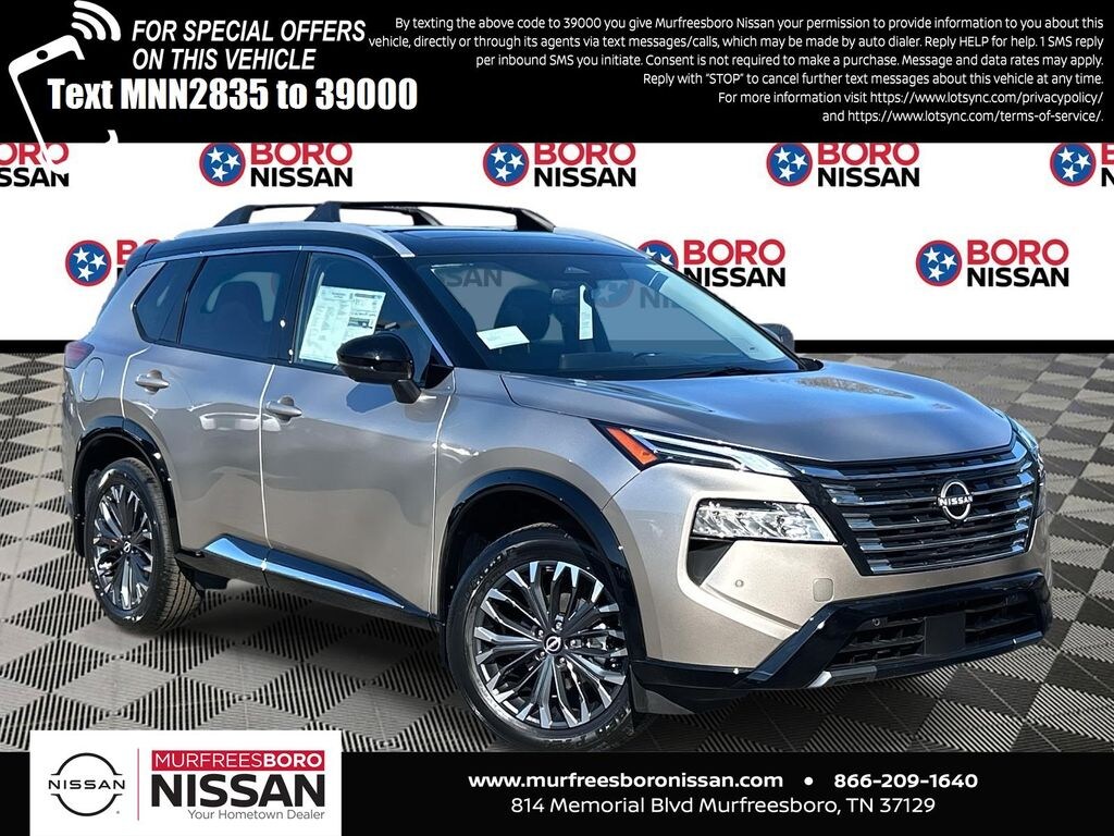 Champagne Silver/Black 2026 Nissan Rogue Platinum AWD CVT with Xtronic 1.5L DOHC APPLE ANDRIOD CAR PLAY, REAR BACKUP CAMERA, BLUETOOTH, AWD, 10 Speakers, 4-Wheel Disc Brakes, ABS brakes, Air Conditioning, Alloy wheels, AM/FM radio: SiriusXM w/360L, Auto High-beam Headlights, Auto-dimming Rear-View mirror, Automatic temperature control, Black Splash Guards (set of 4), Bose Premium Audio System, Brake assist, Bumpers: body-color, Chrome Rear Bumper Protector, Delay-off headlights, Driver door bin, Driver vanity mirror, Dual front impact airbags, Dual front side impact airbags, Electronic Stability Control, Emergency communication system: NissanConnect Services, Floor Mats with 2-Piece Cargo Area Protector, Four wheel independent suspension, Front anti-roll bar, Front Bucket Seats, Front Center Armrest, Front dual zone A/C, Front reading lights, Fully automatic headlights, Garage door transmitter: myQ Connected Garage, Head-Up Display, Heads-Up Display, Heated door mirrors, Heated Front Bucket Seats, Heated front seats, Heated Rear Seats, Heated steering wheel, Illuminated entry, Knee airbag, Low tire pressure warning, Memory seat, Motion-Activated Power Liftgate, Navigation system: Google Maps, Occupant sensing airbag, Outside temperature display, Overhead airbag, Overhead console, Panic alarm, Passenger door bin, Passenger vanity mirror, Platinum Premium Package, Power door mirrors, Power driver seat, Power Liftgate, Power moonroof, Power passenger seat, Power steering, Power windows, Quilted Semi-Aniline Leather-Appointed Seat Trim, Radio data system, Radio: AM/FM NissanConnect with Navigation, Rear anti-roll bar, Rear reading lights, Rear seat center armrest, Rear side impact airbag, Rear window defroster, Rear window wiper, Remote keyless entry, Roof Rail Cross Bars, Security system, Speed control, Speed-sensing steering, Speed-Sensitive Wipers, Split folding rear seat, Spoiler, Steering wheel mounted audio controls, Tachometer, Telescoping steering wheel, Tilt steering wheel, Traction control, Tri-Zone Automatic Temperature Control, Trip computer, Turn signal indicator mirrors, Variably intermittent wipers, Wheels: 19" Unique Dark Painted Aluminum Alloy, Wireless Apple CarPlay/Wireless Android Auto, SUNROOF, LEATHER, NAVIGATION, ALLOY WHEELS, AWD.