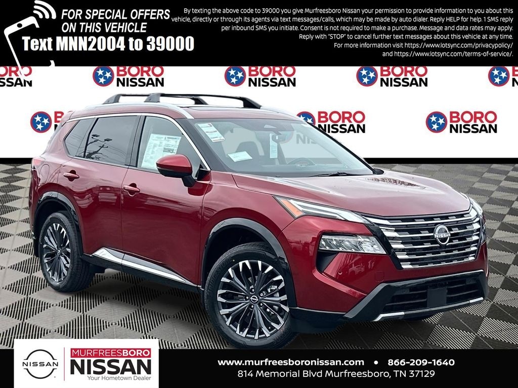 Scarlet Ember Tintcoat 2026 Nissan Rogue Platinum AWD CVT with Xtronic 1.5L DOHC APPLE ANDRIOD CAR PLAY, REAR BACKUP CAMERA, BLUETOOTH, AWD, 10 Speakers, 4-Wheel Disc Brakes, ABS brakes, Air Conditioning, Alloy wheels, AM/FM radio: SiriusXM w/360L, Auto High-beam Headlights, Auto-dimming Rear-View mirror, Automatic temperature control, Black Splash Guards (set of 4), Bose Premium Audio System, Brake assist, Bumpers: body-color, Chrome Rear Bumper Protector, Delay-off headlights, Driver door bin, Driver vanity mirror, Dual front impact airbags, Dual front side impact airbags, Electronic Stability Control, Emergency communication system: NissanConnect Services, First Aid Kit, Floor Mats with 2-Piece Cargo Area Protector, Four wheel independent suspension, Front anti-roll bar, Front Bucket Seats, Front Center Armrest, Front dual zone A/C, Front reading lights, Fully automatic headlights, Garage door transmitter: myQ Connected Garage, Head-Up Display, Heads-Up Display, Heated door mirrors, Heated Front Bucket Seats, Heated front seats, Heated Rear Seats, Heated steering wheel, Illuminated entry, Knee airbag, Low tire pressure warning, Memory seat, Motion-Activated Power Liftgate, Navigation system: Google Maps, Occupant sensing airbag, Outside temperature display, Overhead airbag, Overhead console, Panic alarm, Passenger door bin, Passenger vanity mirror, Platinum Premium Package, Power door mirrors, Power driver seat, Power Liftgate, Power moonroof, Power passenger seat, Power steering, Power windows, Premium Paint, Quilted Semi-Aniline Leather-Appointed Seat Trim, Radio data system, Radio: AM/FM NissanConnect with Navigation, Rear anti-roll bar, Rear reading lights, Rear seat center armrest, Rear side impact airbag, Rear window defroster, Rear window wiper, Remote keyless entry, Roof Rail Cross Bars, Security system, Speed control, Speed-sensing steering, Speed-Sensitive Wipers, Split folding rear seat, Spoiler, Steering wheel mounted audio controls, Tachometer, Telescoping steering wheel, Tilt steering wheel, Traction control, Tri-Zone Automatic Temperature Control, Trip computer, Turn signal indicator mirrors, Variably intermittent wipers, Wheels: 19" Unique Dark Painted Aluminum Alloy, Wireless Apple CarPlay/Wireless Android Auto, NAVIGATION, ALLOY WHEELS, AWD.